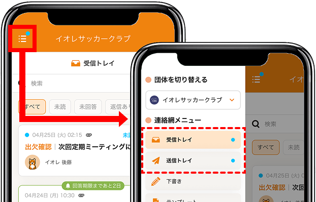 連絡は「受信トレイ」と「送信トレイ」で管理します。らくらく連絡網+では、各トレイに機能を分けることで役割を明確にしています。